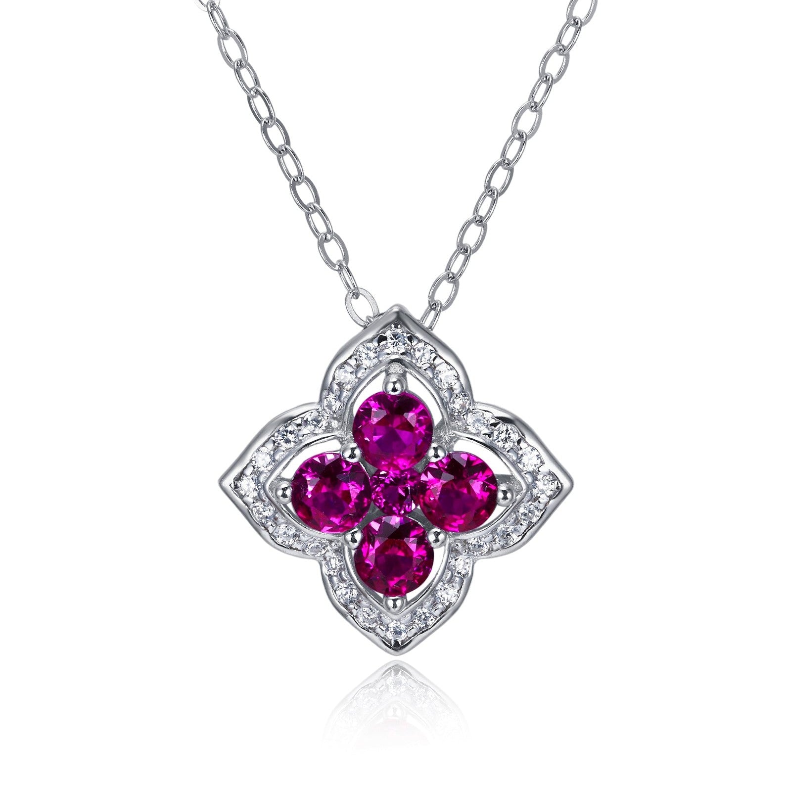 Un pendentif rayonnant inspiré du trèfle, orné de quatre rubis de synthèse éclatants, sertis d'un halo étincelant de moissanite DE/VVS. Confectionné en argent sterling 925 rhodié, ce bijou intemporel apporte couleur, brillance et charme raffiné à toutes vos tenues.