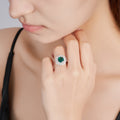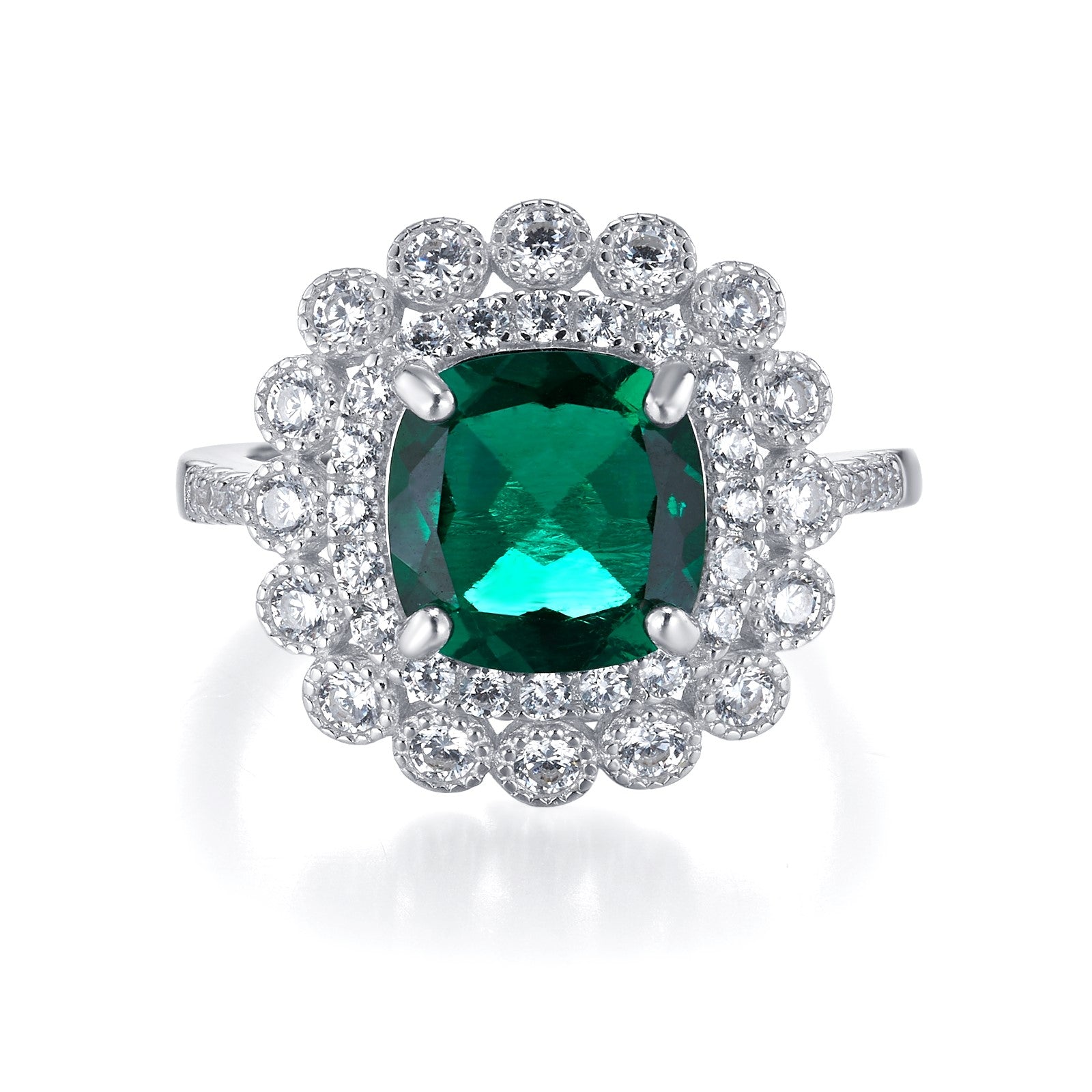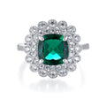 A vibrant 2.1 ct cushion-cut lab-grown emerald sits at the heart of this radiant halo ring, its deep green tone glowing with elegant intensity. Surrounding the centre stone is a double halo of finely cut cubic zirconia, adding brilliance and a soft floral-inspired silhouette.